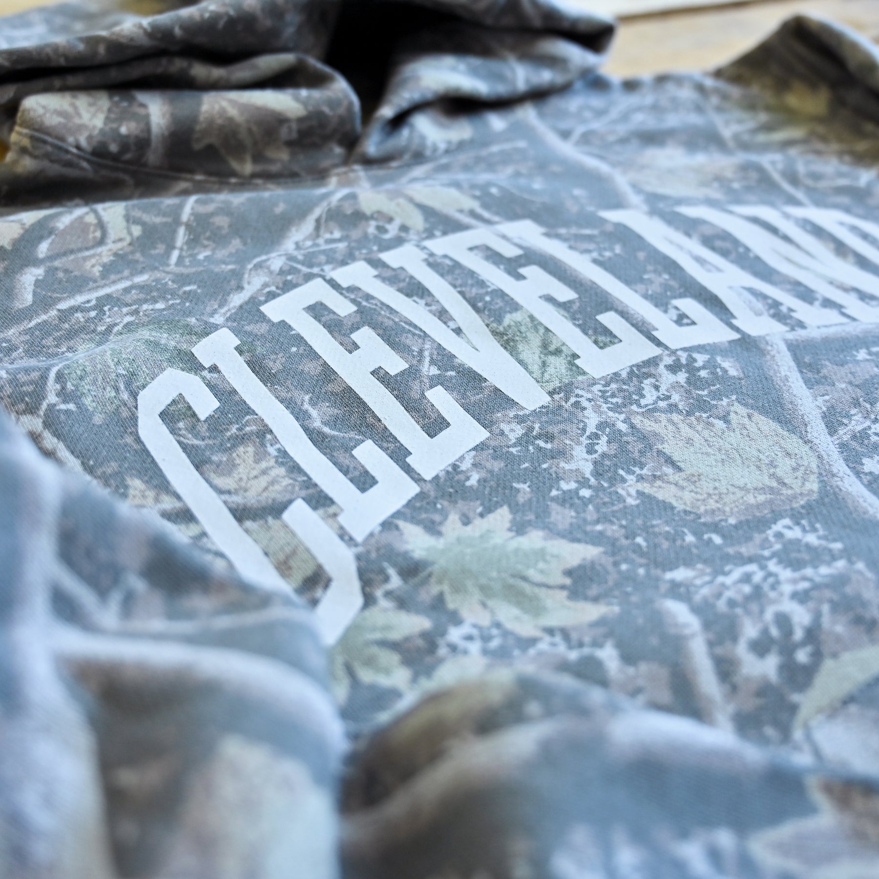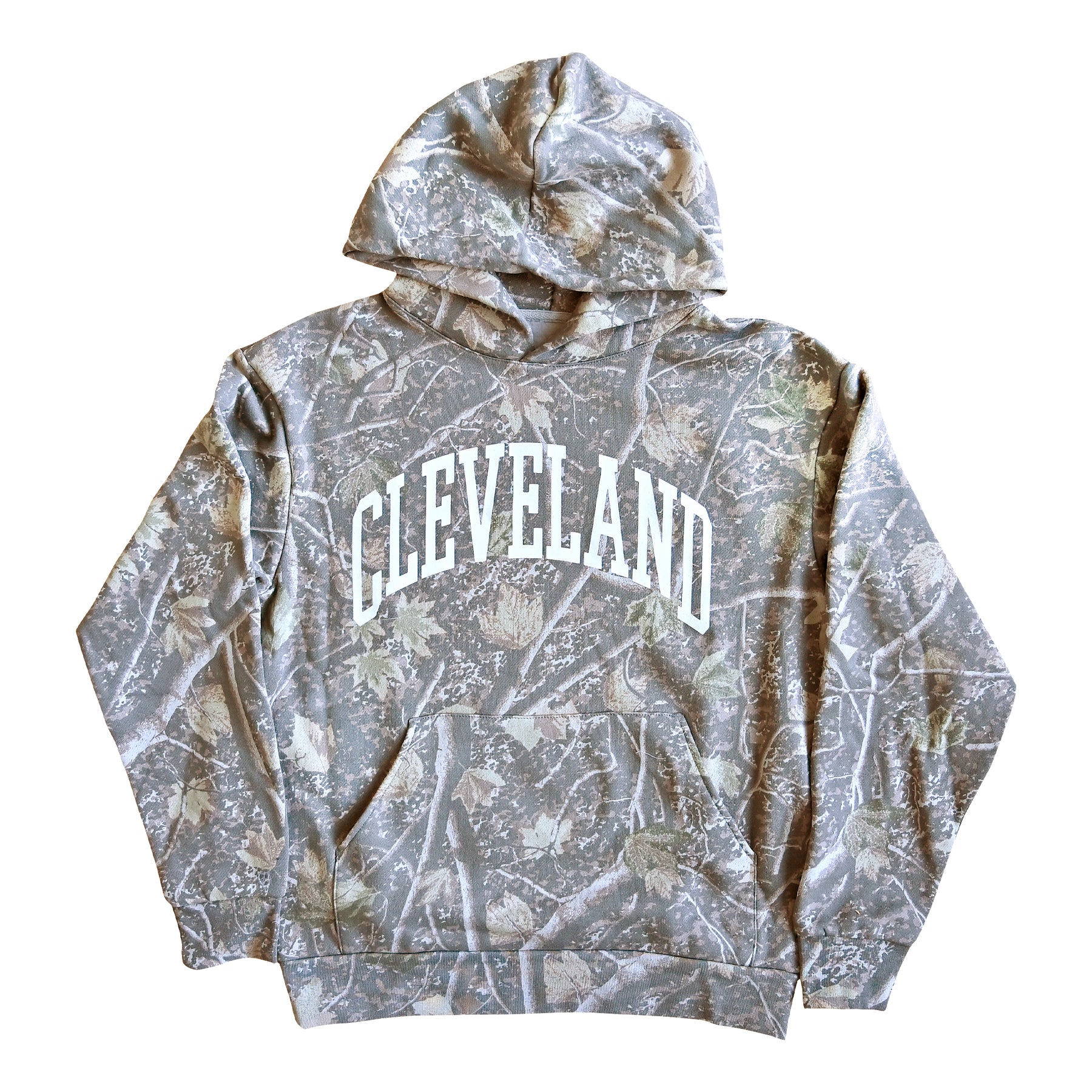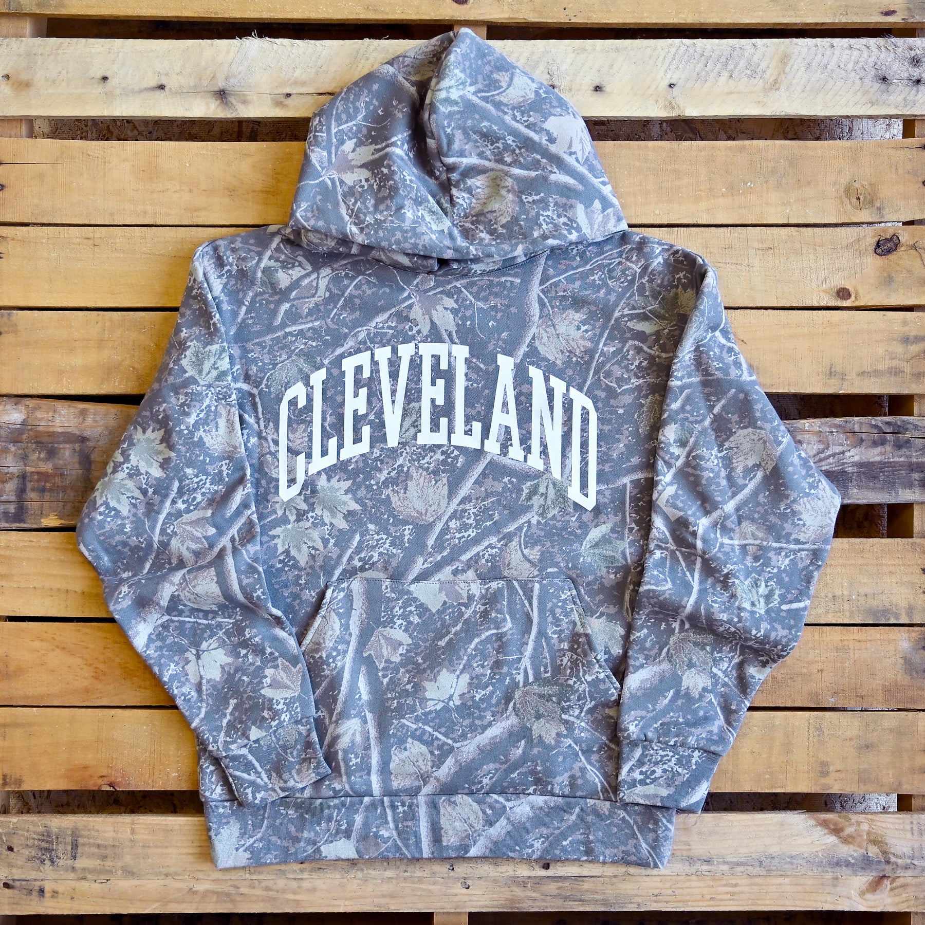 Blend into the wilderness while showing off your city pride with the Cleveland Arch Hoodie in Deadwood Camo. Inspired by Ohio’s rugged outdoor spirit, this hoodie combines a classic collegiate look with a nature-inspired camo pattern that feels right at home from the Metroparks to downtown CLE.