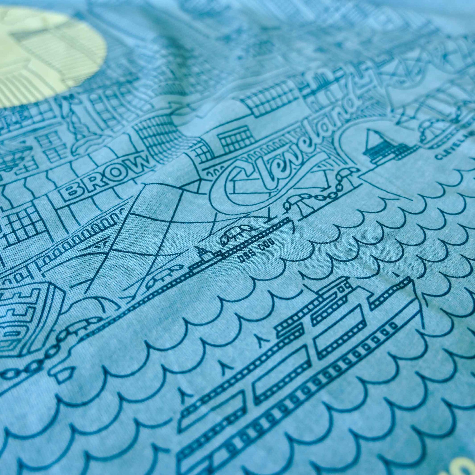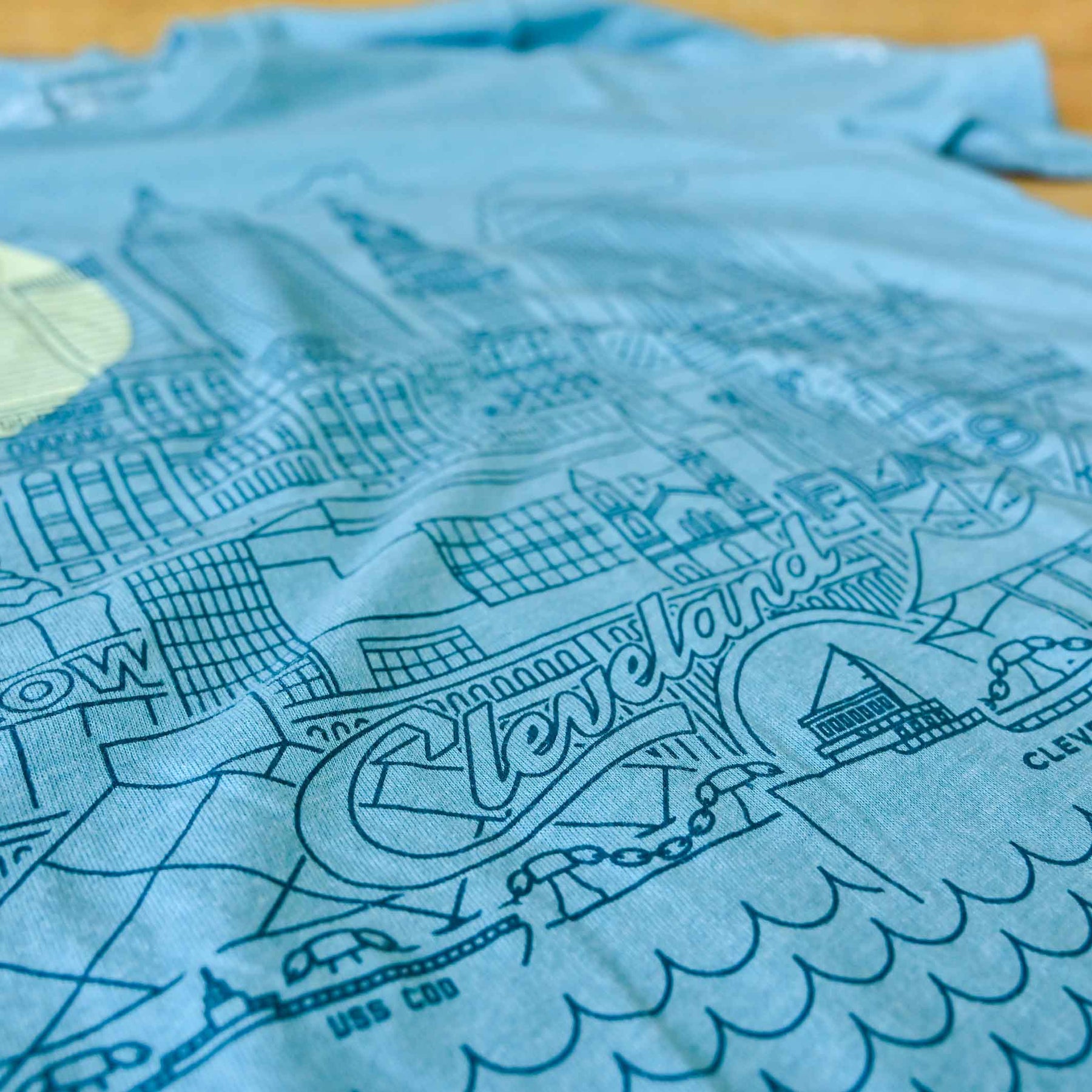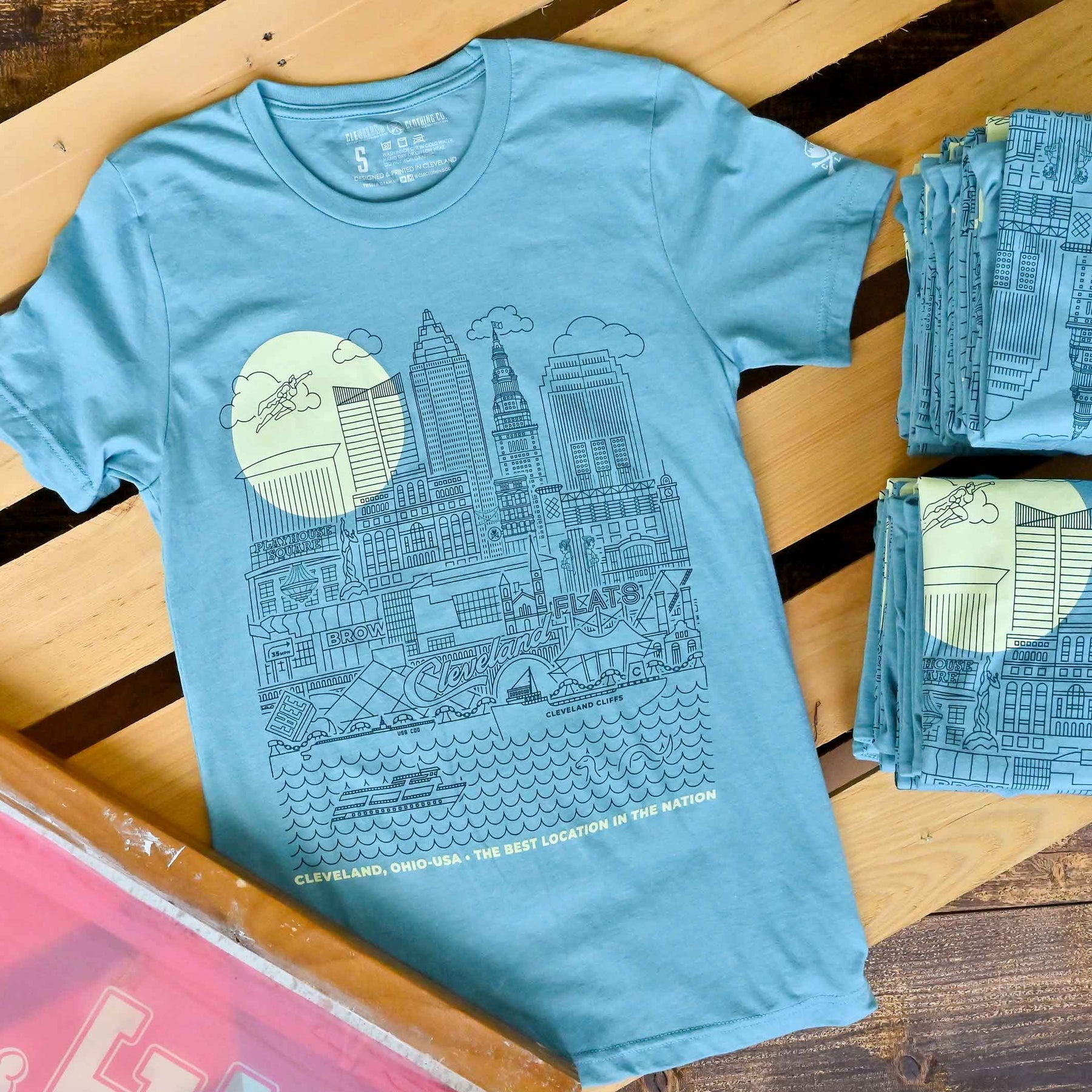Designed and printed locally here in Cleveland on a super soft crewneck tee shirt (52% cotton / 48% poly) Polyester retains shape and elasticity; Cotton lends both comfort and durability. Fits like a well-loved favorite, featuring a crew neck, short sleeves and designed with superior Airlume combed and ring-spun cotton.
