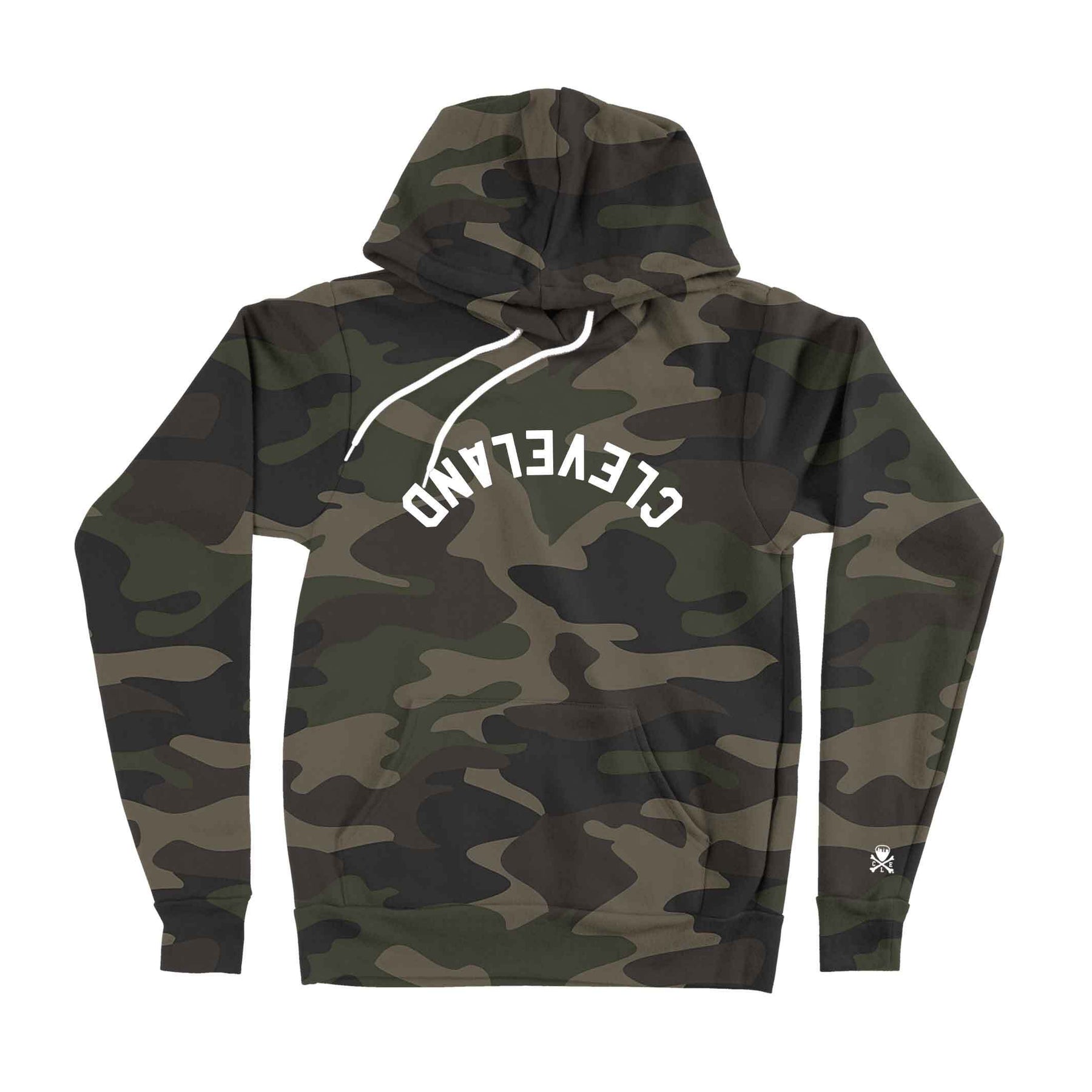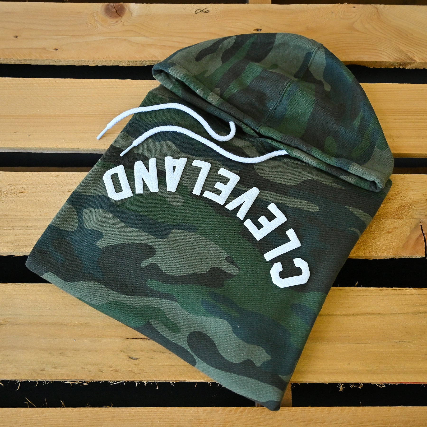 Show your city pride with a twist. The Camo Cleveland Hoodie brings together a classic camo pattern with a trendy, upside-down Cleveland lettering — perfect for repping the Land wherever you go. Whether you're layering up for the season or just keeping it casual, this hoodie keeps you warm, comfortable, and on-point.