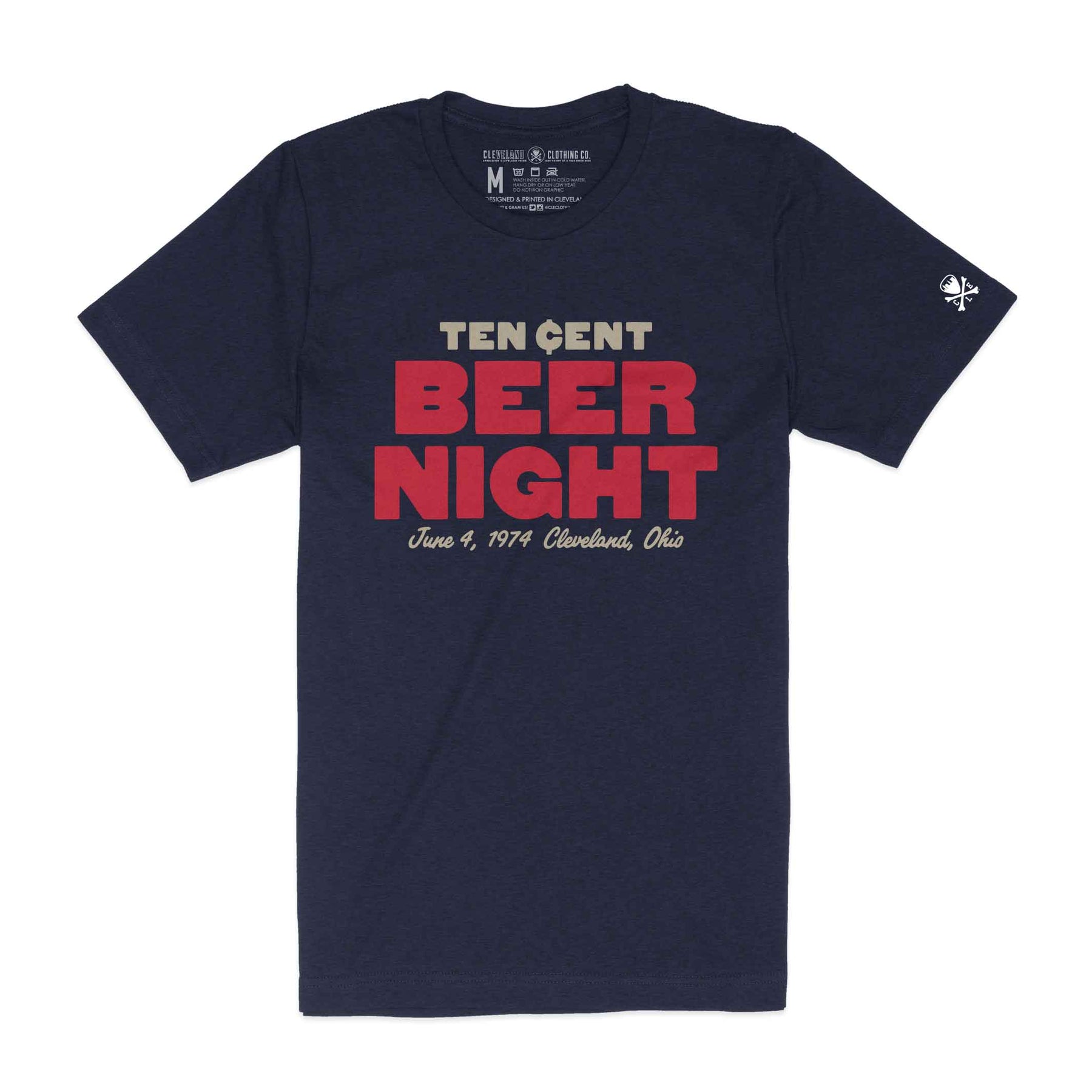 Designed and printed locally here in Cleveland on a super soft deep heather navy crewneck tee shirt (52% cotton / 48% poly). Polyester retains shape and elasticity; Cotton lends both comfort and durability. Fits like a well-loved favorite, featuring a crew neck, short sleeves and designed with superior Airlume combed and ring-spun cotton.