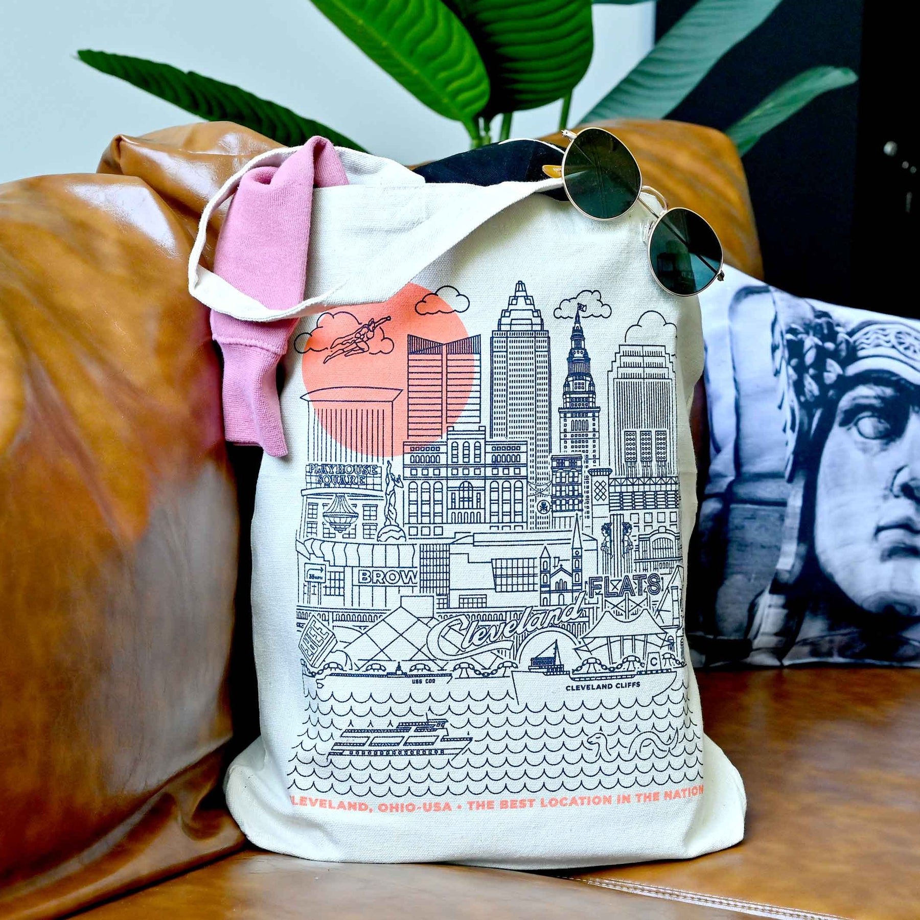 Designed and printed locally in Cleveland on a mid-weight, recycled, gusseted tote bag. This bag is made of 75/25 recycled cotton/recycled polyester canvas with 20" self-fabric handles. 15" W x 16" L x 3" D